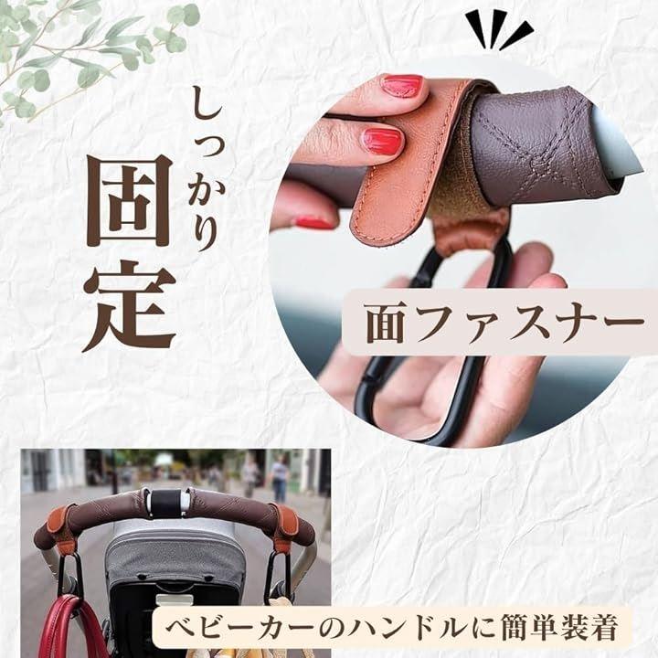 「テープでベビーカーに簡単装着」PUレザー製のストラップは裏面が面ファスナー仕様で、丸型・角型・楕円型など多様なベビーカーのハンドルにしっかりと装着できます。