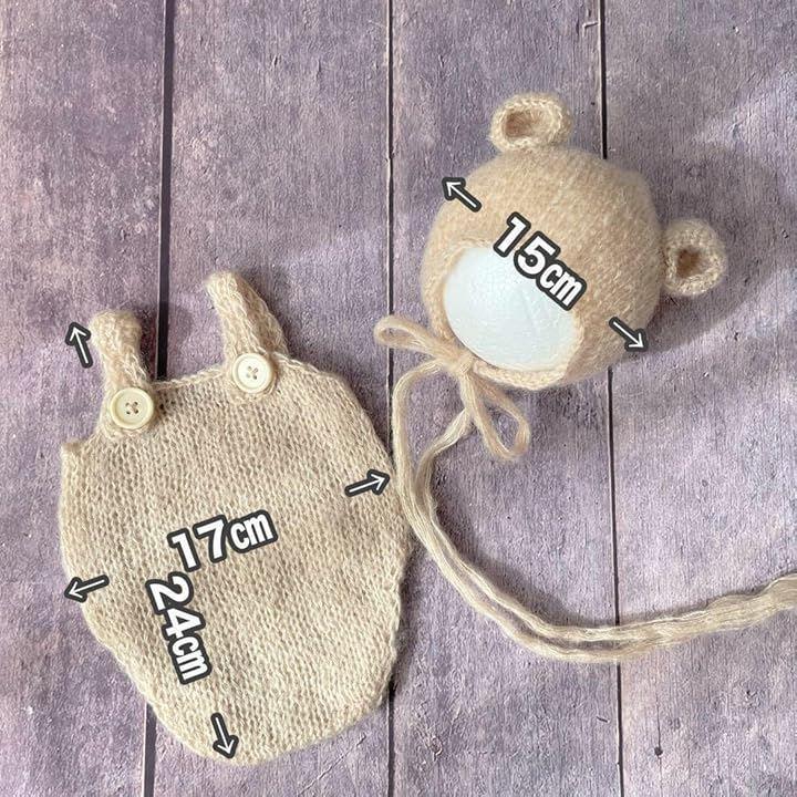 柔らかな手編みのベビー用くま耳帽子とオーバーオールセットは、ニューボーンフォト 新生児フォト撮影に最適なアイテムです。