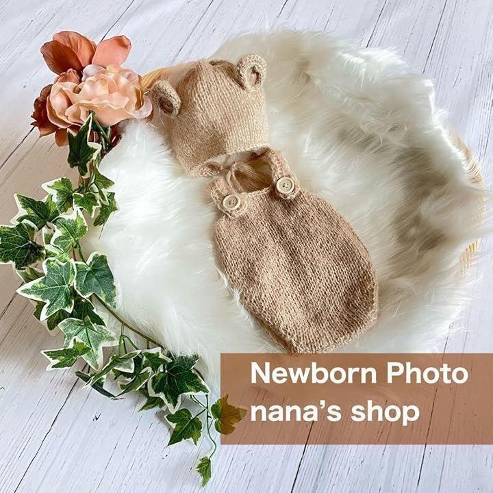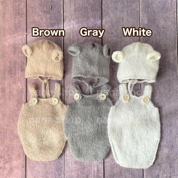 柔らかな手編みのベビー用くま耳帽子とオーバーオールセットは、ニューボーンフォト 新生児フォト撮影に最適なアイテムです。