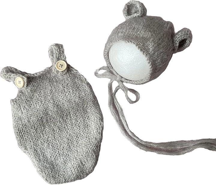 デザイン: くま耳付きボンネットとオーバーオールの2点セット、新生児の記念撮影に最適な可愛らしいコーディネート