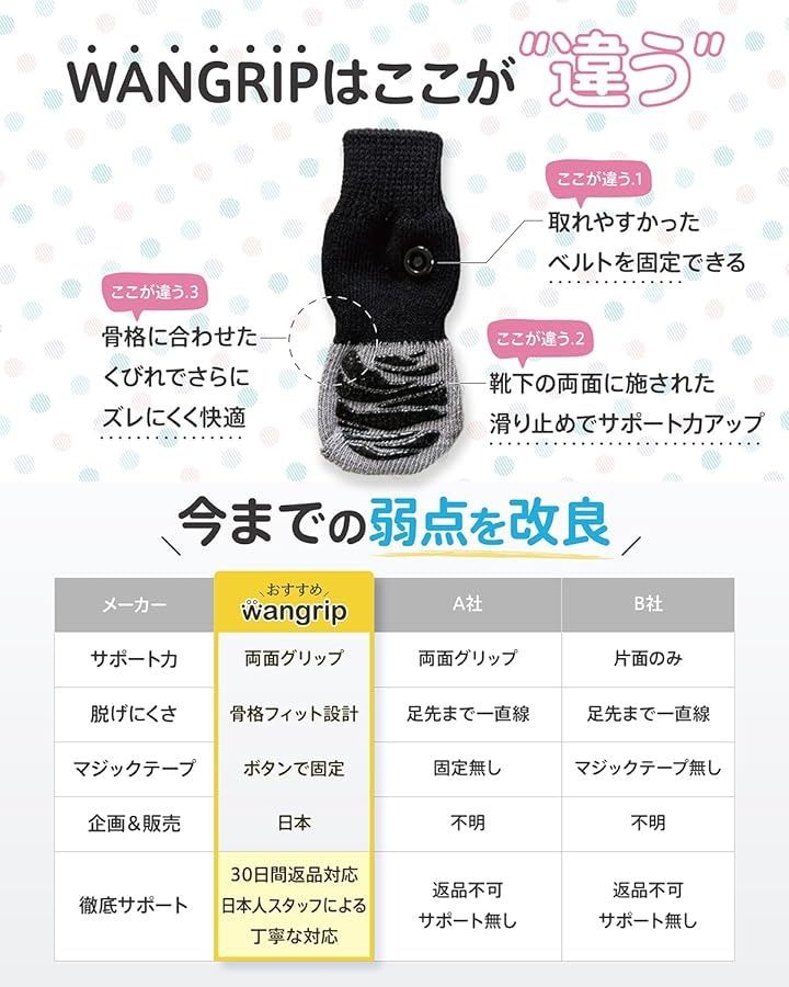 「両面グリップで歩行をしっかりサポート」 愛犬の歩行をサポートするために開発された、両面グリップ付きの犬用靴下WANGRIPです。