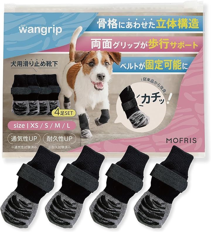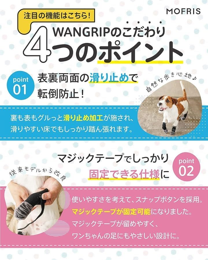ベルトが固定可能になりましたWANGRIP 犬用靴下 滑り止め 脱げにくい 足舐め防止 足カバー 肉球保護 テープ付き 犬用ソックス 転倒防止 屋内用 通気性 シニア犬 サポート