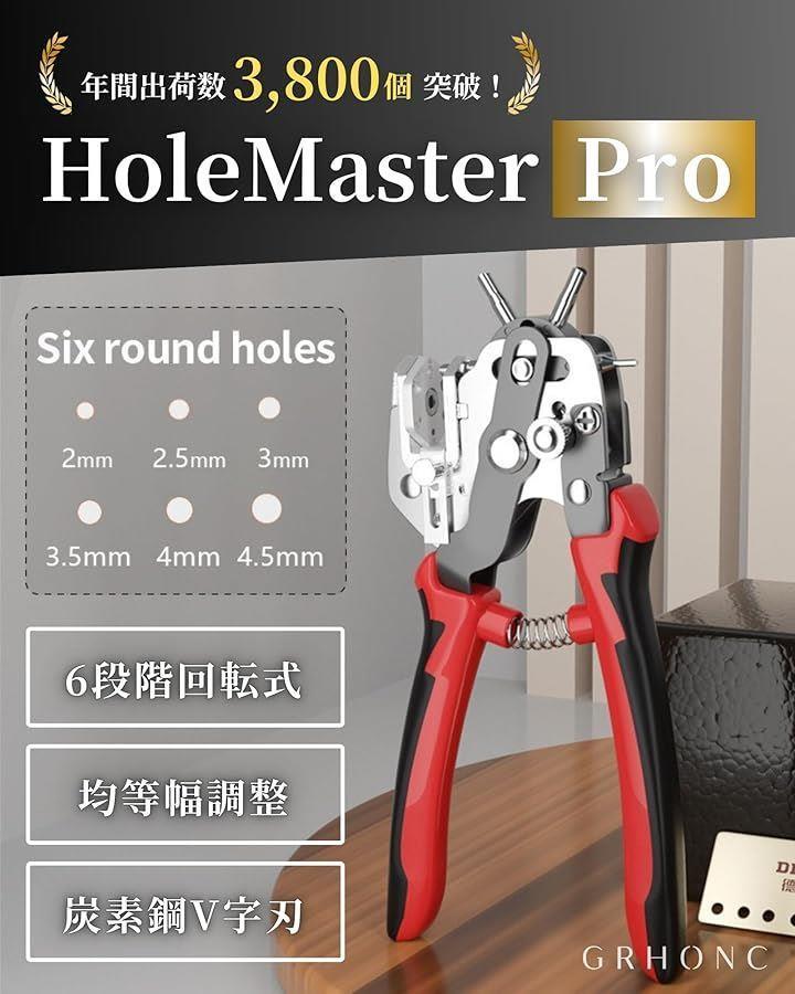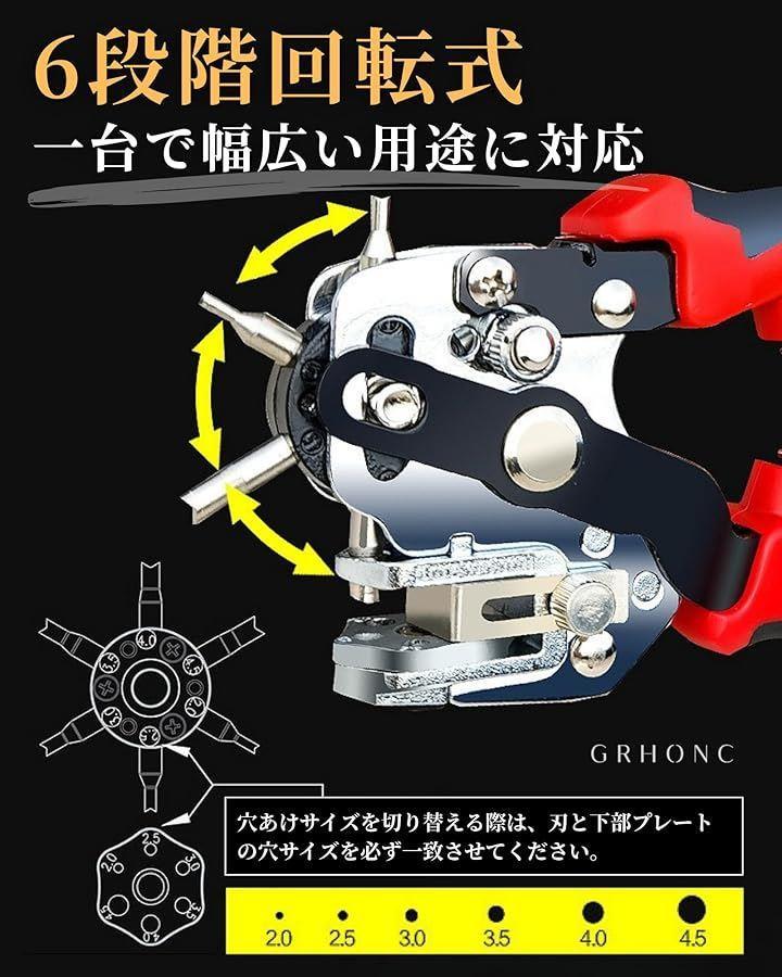 「年間3,800個出荷。6段階回転式ヘッドで簡単穴あけ」2mm~4.5mmまで6種類の穴サイズを回転式ヘッドで簡単に変更でき、、ベルト穴あけやレザークラフト作業に最適。