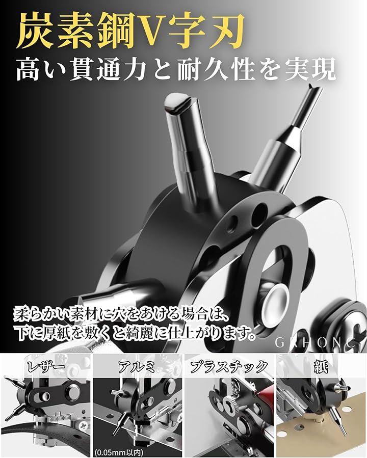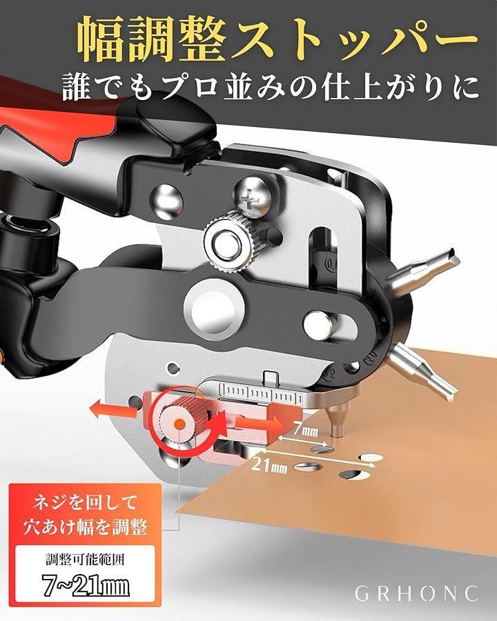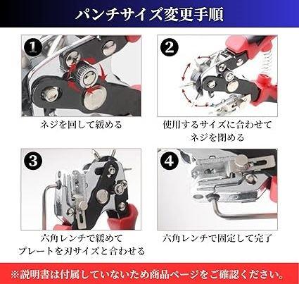 「セット内容」穴あけパンチ本体+六角レンチ「対応穴サイズ」2mm・2.5mm・3mm・3.5mm・4mm・4.5mm「重量」約360g「刃材質」炭素鋼「調整幅」7~21mm「機能」回転式ヘッド・可動式ストッパー・拡張レバー・V字型刃・軽量設計