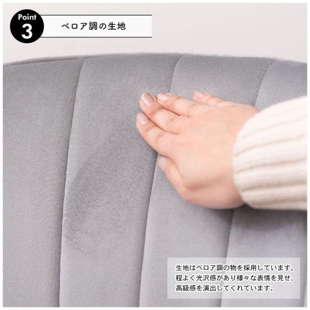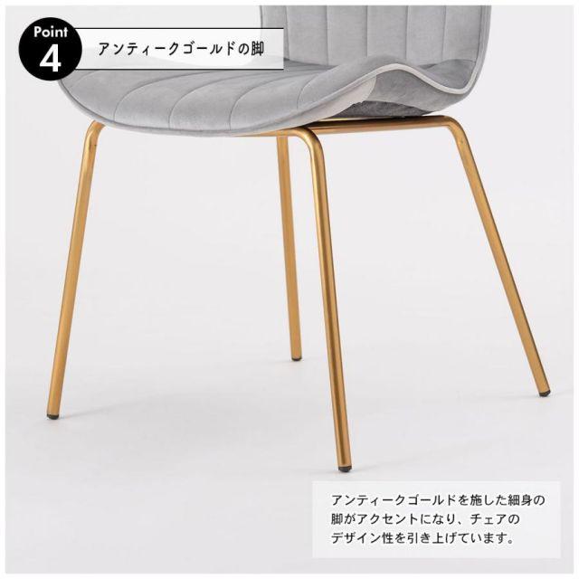 ●ベロア調の生地×アンティークゴールド脚の組合せが、ガーリーでトレンド感のある雰囲気を演出。●身体を包み込むようなフォルムで、デザイン性にプラスして使いやすさにもとことんこだわりました。●背・座面共に緩やかなカーブを描いているので、身体にフィットして包み込んでくれます。●背面も座面も弾力があり、クッション性もある作りになっているので、座り心地も抜群。●生地はベロア調の物を採用。程よく光沢感があり様々な表情を見せ高級感を演出。●アンティークゴールドを施した細身の脚がアクセントになり、チェアのデザイン性を引き上げています。
