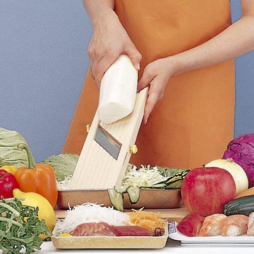 通常1-5営業日で発送:「野菜の下ごしらえはこれ一本でOK!」【日本製・安全器つき・三種交換刃つき】【特長】・万能野菜調理器として、野菜のスライスからお刺身のつま、 たまねぎのみじん切りまでいろいろな用途で使えます。・厚さ(約0.3mm~5mm)調節ができます・料理に合わせて3種の交換刃が選べます・指先をガードする安全器具付きで安心・取り外しが出来てお掃除が簡単・フックにかけられるので収納もスッキリ・たまねぎのみじん切りもOK! 【使用方法】(交換刃三種使い分け)・小歯・・・お刺身のけんつまや人参サラダが美しく仕上がります。・中歯・・・きゅうりの千切りやきんぴらごぼうも自由自在。・荒歯・・・大根サラダやフライドポテトも作れます。・中歯か荒歯・・・面倒でつらいたまねぎのみじん切りもあっという間!・交換刃つけずに平刃のみ・・・野菜のスライス
