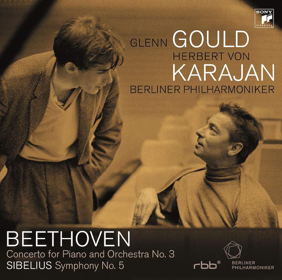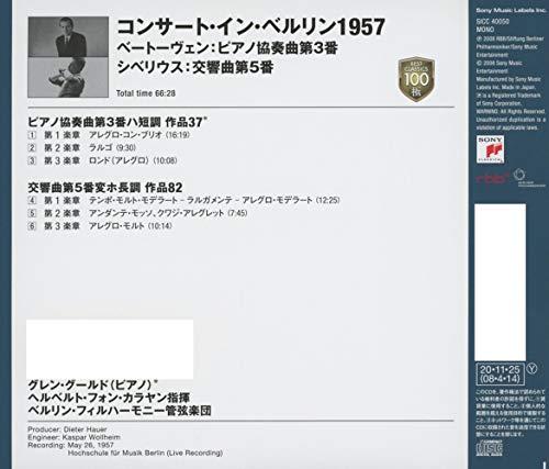 カラヤンとグールドによる1957年の歴史的なライヴ盤。1957年5月24日から26日の3日間、ベルリンのホッホシューレ・ザールにて行われたヘルベルト・フォン・カラヤン指揮によるベルリン・フィルハーモニー管弦楽団のコンサートは、ヒンデミットの「交響曲『画家マティス』」、ベートーヴェンの「ピアノ協奏曲第3番」を前半に、後半にはシベリウスの「交響曲第5番」を置いたものでした。ピアノ・ソロは、すでにデビュー・アルバム「J.S.バッハ:ゴールドベルク変奏曲」を世に問い、話題を集めていた若きグレン・グールド! 彼のディスコグラフィのほとんどはスタジオ録音によるものなのですが、公式、非公式にはいくつかのライヴ・ディスクが存在します。この「ベートーヴェン:ピアノ協奏曲第3番」の録音は、以前からプライヴェート盤のかたちでその存在が知られていた演奏で、2008年にソニー・クラシカルから正規盤としてリリースされたものす。後半に演奏されたシベリウスの「交響曲第5番」が収められていることも注目です。