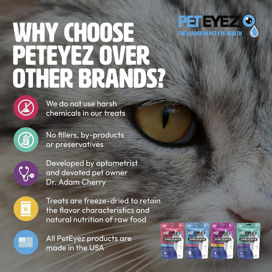 30年経歴の眼科医開発・獣医師監修。18種類のビタミンとミネラル配合の目のサプリメントトリーツ。フリーズドライで嗜好性抜群の全米話題のペット用サプリメントトリーツ。