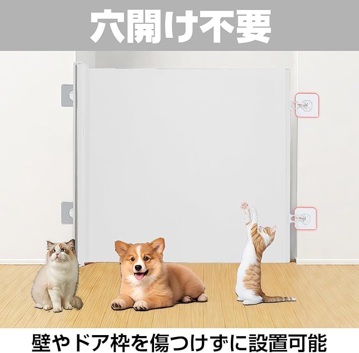 「商品特徴」ロール式ペットゲートは、工具や壁への穴あけが不要な自立・巻き取り式の多機能安全柵です。