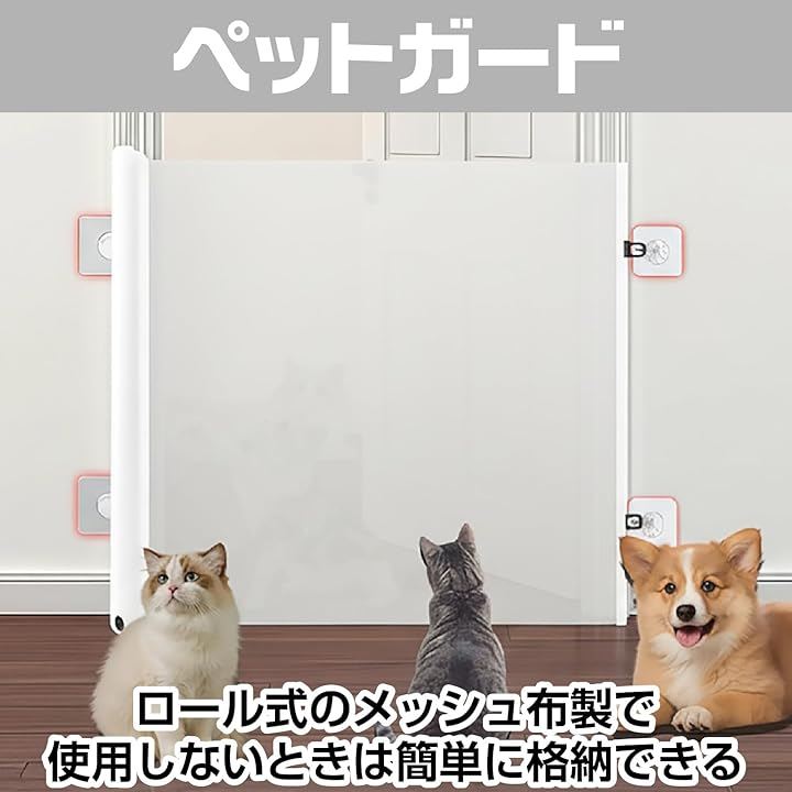 「商品詳細」 セット内容: ロール式ゲート本体、固定金具一式 サイズ: 高さ 約78cm x 幅 最大130cm 重量;350g カラー: ホワイト 材質: メッシュ布、PP/ABS樹脂(本体) 用途: ペットゲート、ベビーゲート、安全柵、間仕切り、猫脱走防止 *モニターの環境により、色の見え方に若干差が生じる場合がございます。