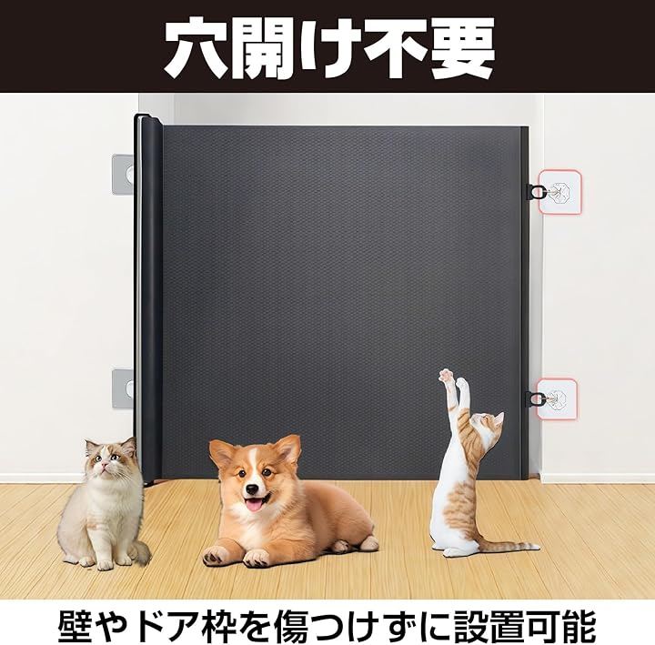 「商品特徴」ロール式ペットゲートは、工具や壁への穴あけが不要な自立・巻き取り式の多機能安全柵です。
