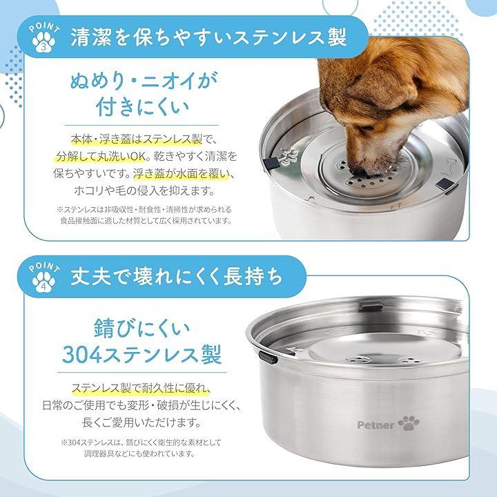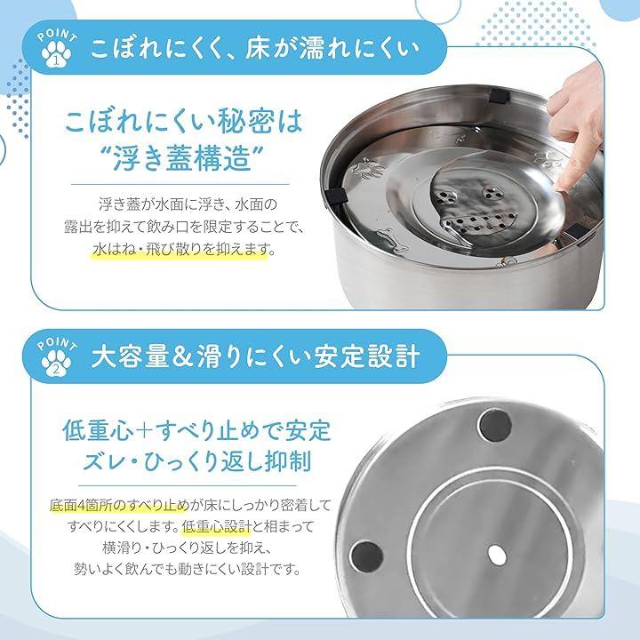 フタが水面に浮かび、水の表面をやさしく覆うことで、ペットが必要な分だけ飲める設計となっております。