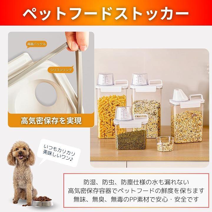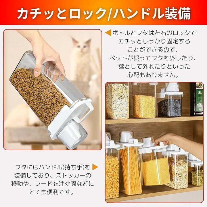 「商品詳細」:ペットフードストッカー 「容量」 1100ML/1800ML/2300ML 「カラー」 タンク:透明クリア/フタ:ホワイト 「材質」 PP 「SIZE」 1100ML:W8xD13xH18cm /1800ML:W8xD13xH24cm/2300ML:W8xD13xH30cm「手入れ方法」 手洗い(食洗機不可) *照明やモニターの環境等により、色の見え方に差が生じる場合がございます。