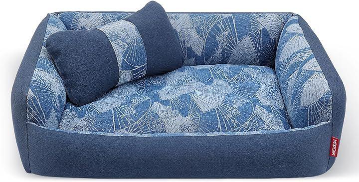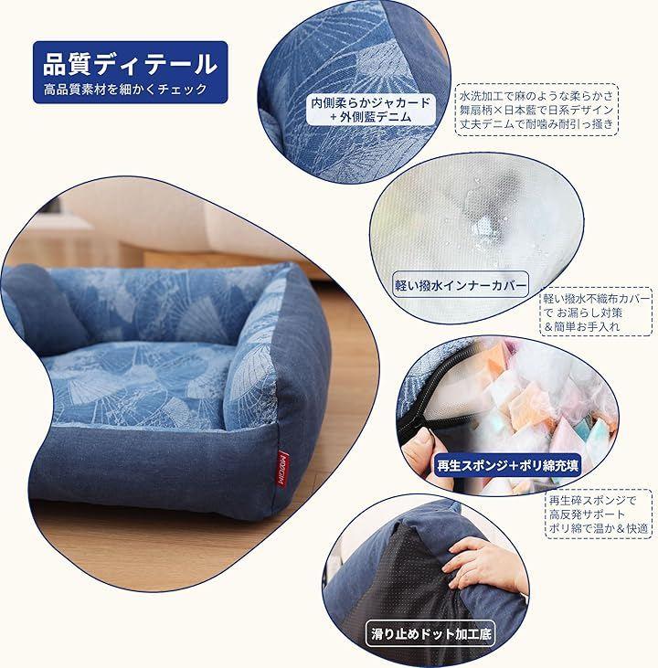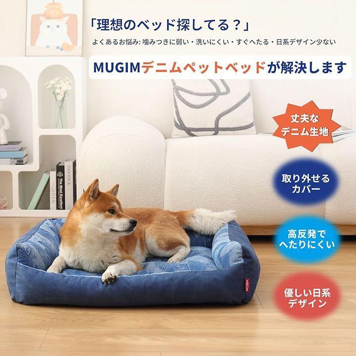 MUGIMペットベッドは、耐噛み丈夫なデニム素材を採用した犬用ベッドで、日系花柄デザインや日系扇柄ブルーの優しい雰囲気が魅力です。