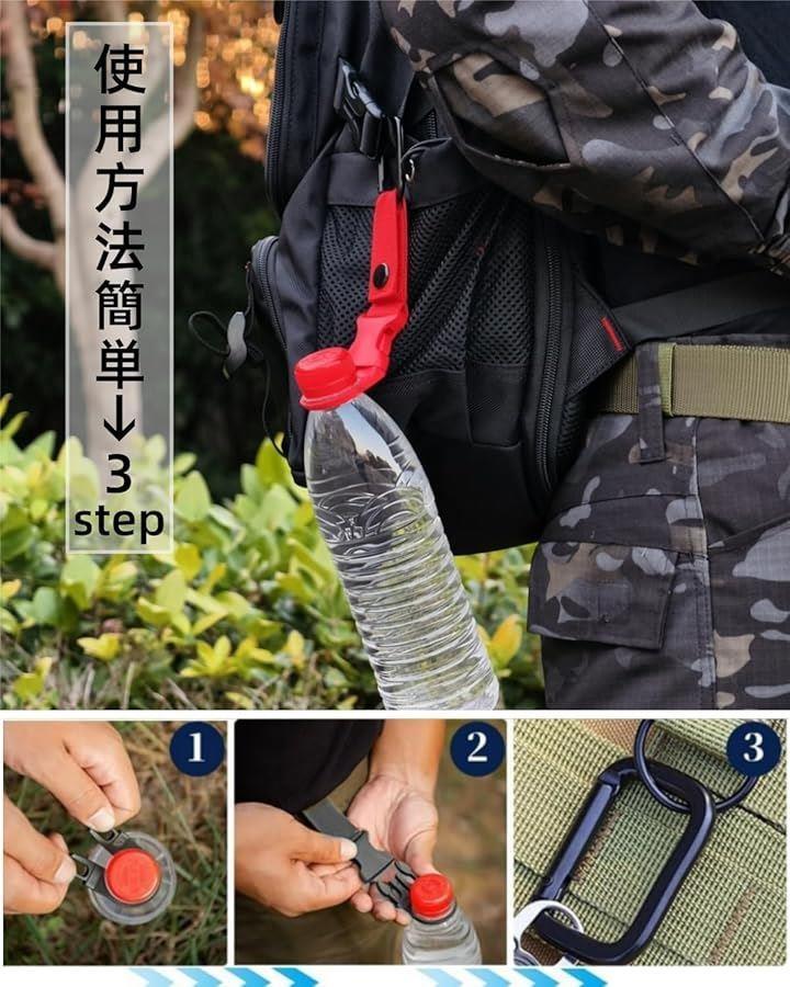 「持ち運びに便利」 旅先や外出するときに、ペットボトルホルダーがあるなら、水筒や飲料等カバンにかけて、喉が渇いた時にバックルを外すだけで飲めます。