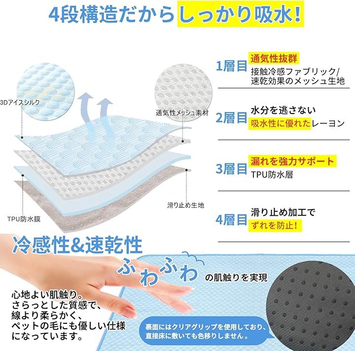 「4層防水・滑り止めゴム底で安心使用」ペット用冷却マットの4層構造の高密度ハイブリッド生地が吸水力を最大化。