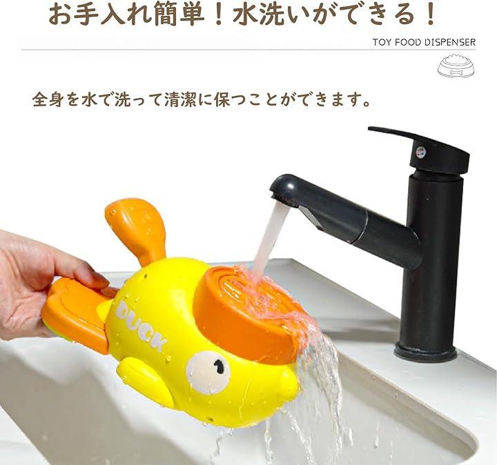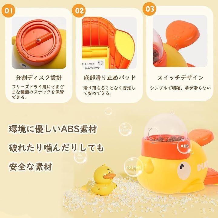 インタラクティブなおやつディスペンサー: アヒルのしっぽを押すと、回転するフードコンテナが作動し、ランダムにおやつが放出されます。