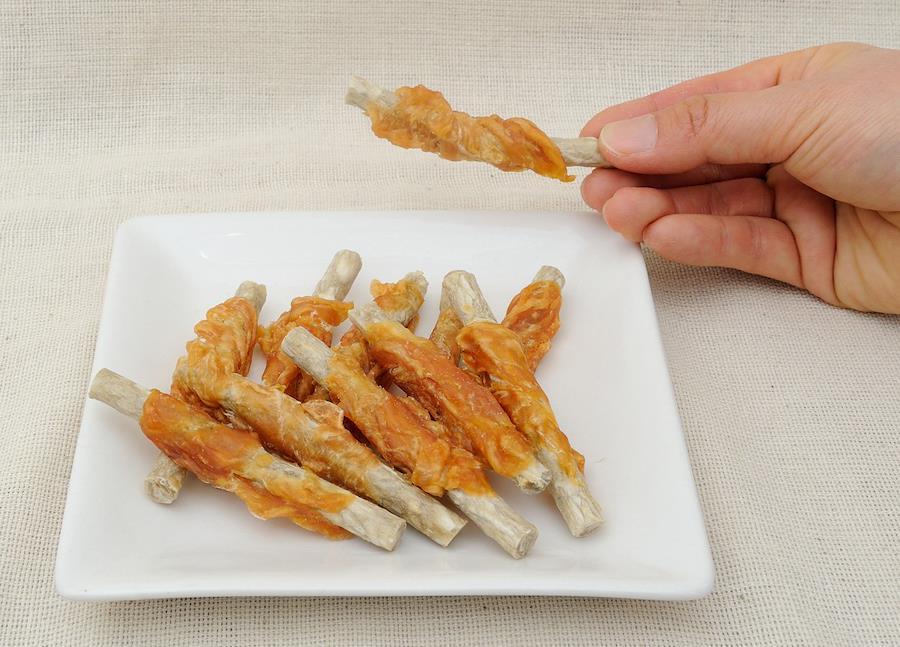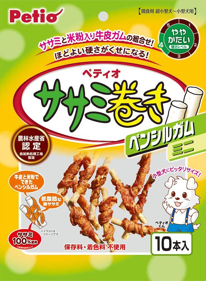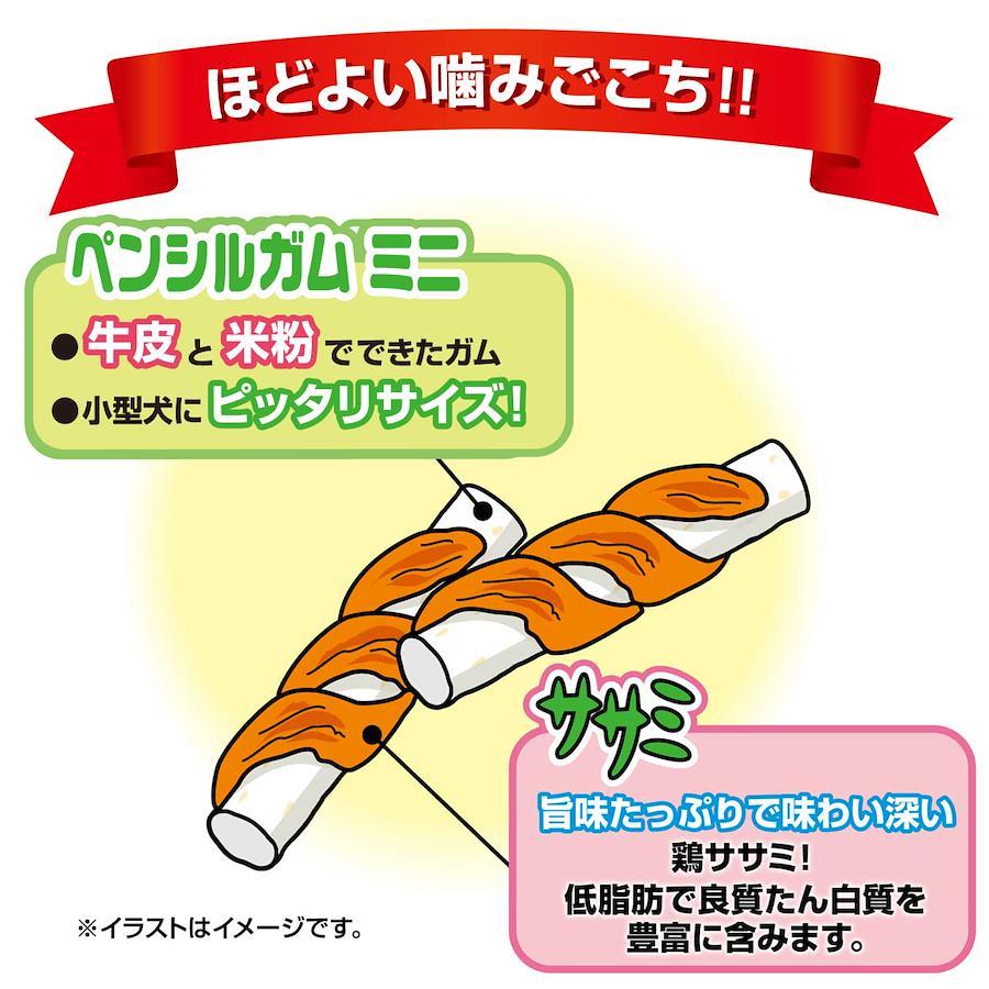 低脂肪な鶏ササミをほどよい噛みごたえのペンシルガムに巻きました。小さな愛犬に食べやすいミニサイズ。保存料・着色料不使用。農林水産省認定 鳥加熱処理工場製造。