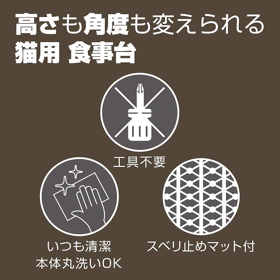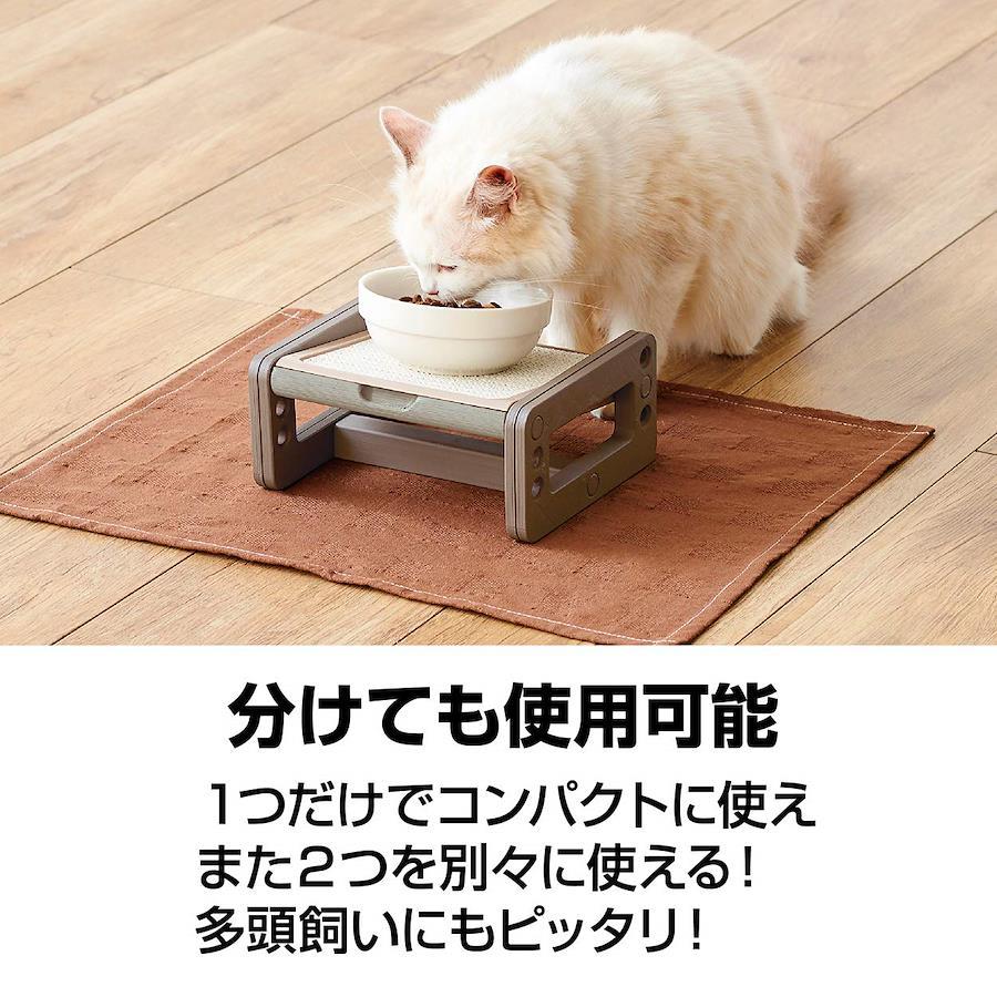 ●テーブルの角度と高さを調節できる食事台(高さ3段階、角度1段階)●連結して1台としての使用も、分けて2台として使用も可能●腰や背中等への負担がかかりにくい姿勢で食事ができるのでシニア猫にもおすすめ●テーブルに角度をつけることで食器の手前に水やフードが集まるため、より食べやすくなる●頭を深く下げずに食事ができるので食道が圧迫されず飲み込みがしやすくなる●工具不要の簡単組み立て●天板が取り外し可能でお手入れが簡単