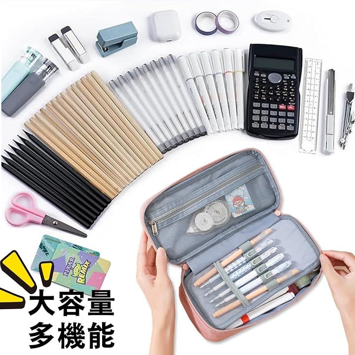 「多機能で使いやすい」このペンケースは、複数のポケットと仕切りがあり、文房具を種類ごとに分けて収納できます。