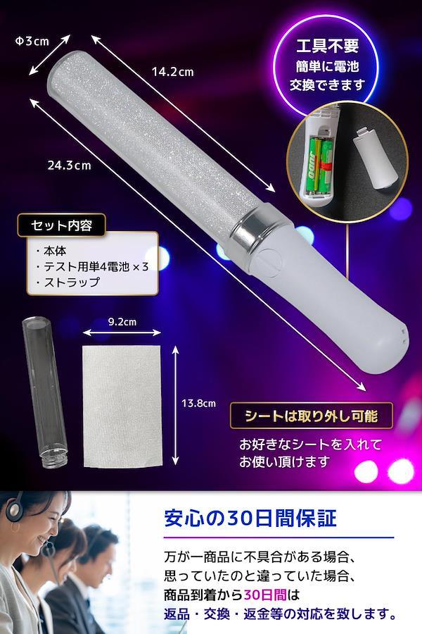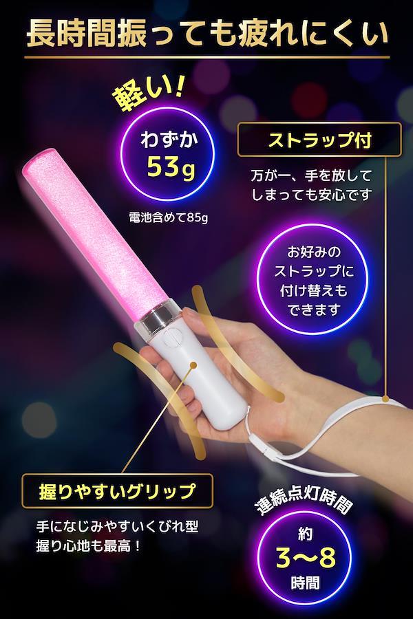 【高輝度LED】3W RGBW LED搭載。従来品より明るく鮮やかな発色で、遠くまで光を届けます。【24色カラーチェンジ】24色搭載のため、あなたの推し色がきっと見つかります!曲や推しメンカラーに合わせたペンライトで、もっとイベントやコンサートを楽しめます!【超簡単操作】2つのボタンで簡単に操作できます。複雑な操作は一切ありません。【軽量、持ちやすい】わずか53g(電池含めて85g)。握りやすさを考慮したグリップ形状で、長時間振っても疲れにくい!【落下防止】 落下防止用にストラップがついています。手にしっかり通すことで、振った勢いでペンライトを落とす心配がなくなります。 ※お好みのストラップに付け替えも可能です。【免責事項】メーカーによる商品リニューアルに伴いパッケージ(内容量も含む)変更が行われた場合、新パッケージでお届け致します事ご了承願います。