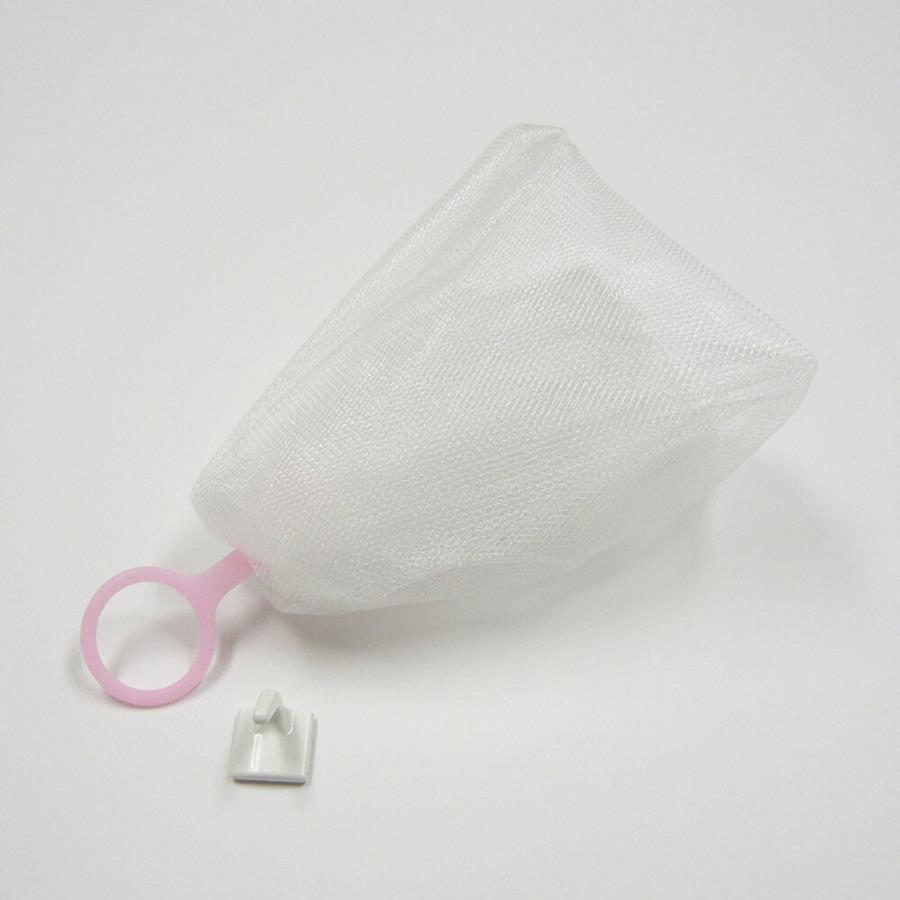 ●保管用の粘着フック付。使用後は石鹸を吊るして保管できるのでヌルヌルの発生を抑えます。