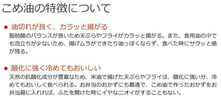 油を加熱することで発生する油酔い物質(アクロレイン)が他の食用油に比べて少なく、快適に調理ができる
