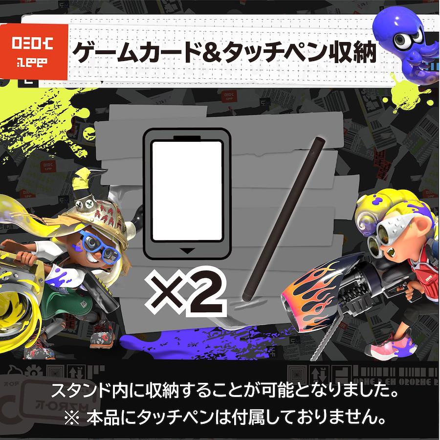 ・Nintendo Switch、Nintendo Switch(有機ELモデル)、Nintendo Switch Liteのどれでも使用できる卓上スタンドです。・スプラトゥーン3のメインかラーとイカタコのポップなデザインのプレイスタンドとなっております。・ワイドな設置面でしっかりNintendo Switch本体を支えます。・縦置き状態のゲームプレイが可能。縦置きの際はハードの固定位置を低くすることで、背もたれ部分を広く設け、安定感をもたせます。・スタンド内にNintendo Switch タッチペンとゲームカードが最大2枚収納可能。・スタンドの角度調整が5段階(65度、60度、50度、40度、30度)で可能となりました。・スタンドの下部にケーブルが通す隙間があり、充電したままのゲームプレイが可能です。
