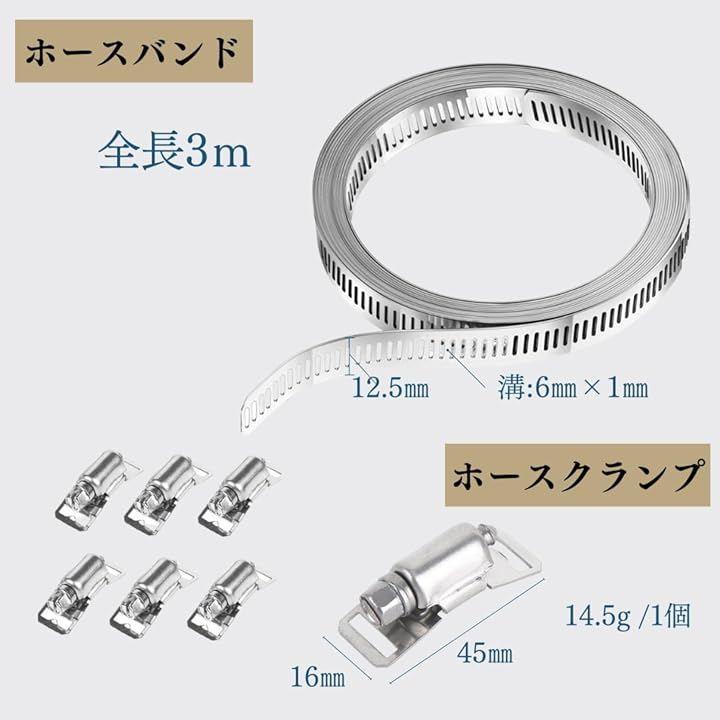「サイズ」ホースバンド バンド幅:12.5mm 長さ:3m バンドの溝:6mm x 1mm バンド厚み:0.6mm クランプサイズ:16mm x 45mm 重さ:1個14.5g 6個入り