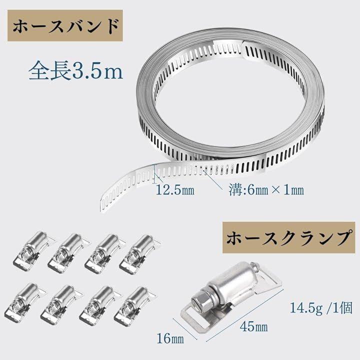 「サイズ」ホースバンド バンド幅:12.5mm 長さ:3.5m バンドの溝:6mm x 1mm バンド厚み:0.6mm クランプサイズ:16mm x 45mm 重さ:1個14.5g 8個入り