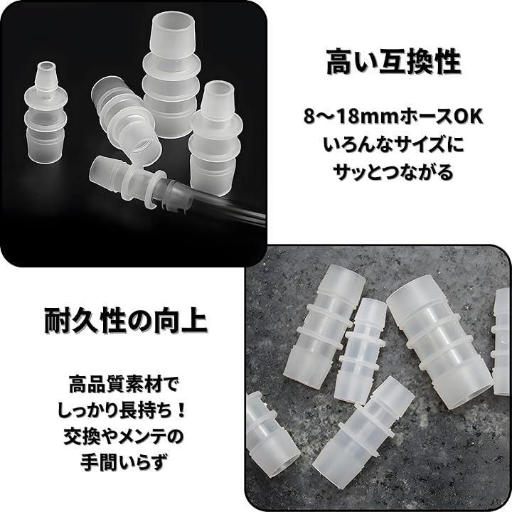 「高い互換性」このホース継手は、8mmから18mmまでの異なる口径に対応しており、さまざまなホースシステムに簡単に接続できます。