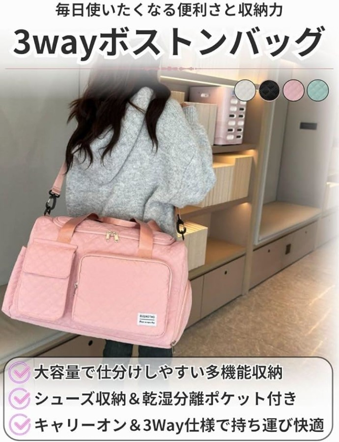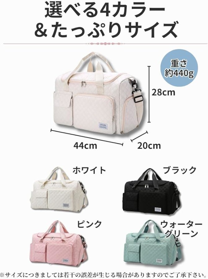 旅行やジム、フィットネス、ヨガ、ゴルフ、合宿、出張など、幅広いシーンに対応する実用性の高いバッグです。