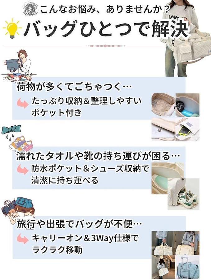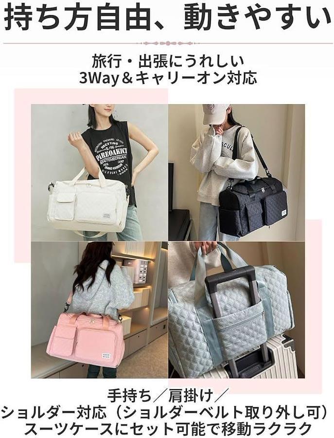 旅行やジム、フィットネス、ヨガ、ゴルフ、合宿、出張など、幅広いシーンに対応する実用性の高いバッグです。