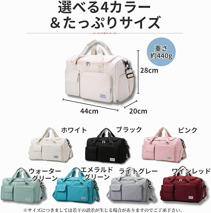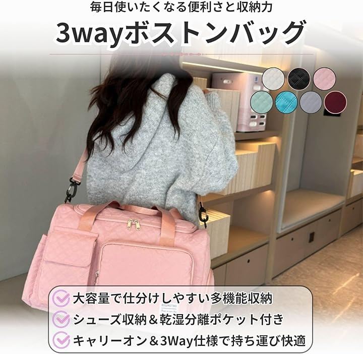 旅行やジム、フィットネス、ヨガ、ゴルフ、合宿、出張など、幅広いシーンに対応する実用性の高いバッグです。