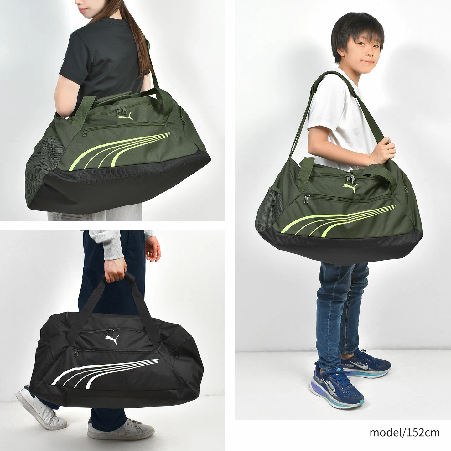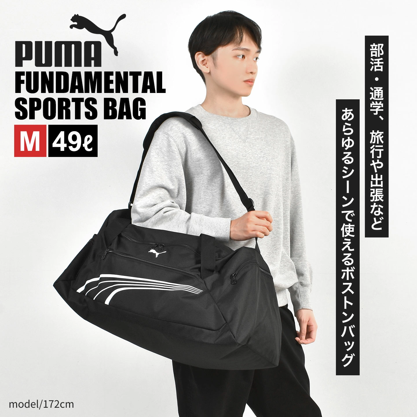 2?3泊の旅行や部活、ジム通いにぴったりな PUMAファンダメンタルスM スポーツバッグ。容量は約 49L と大容量で、着替えやシューズ、タオルなどもしっかり収納可能。フロントと両サイドに便利な外側ポケット付きで、小物やドリンクの収納にも最適です。