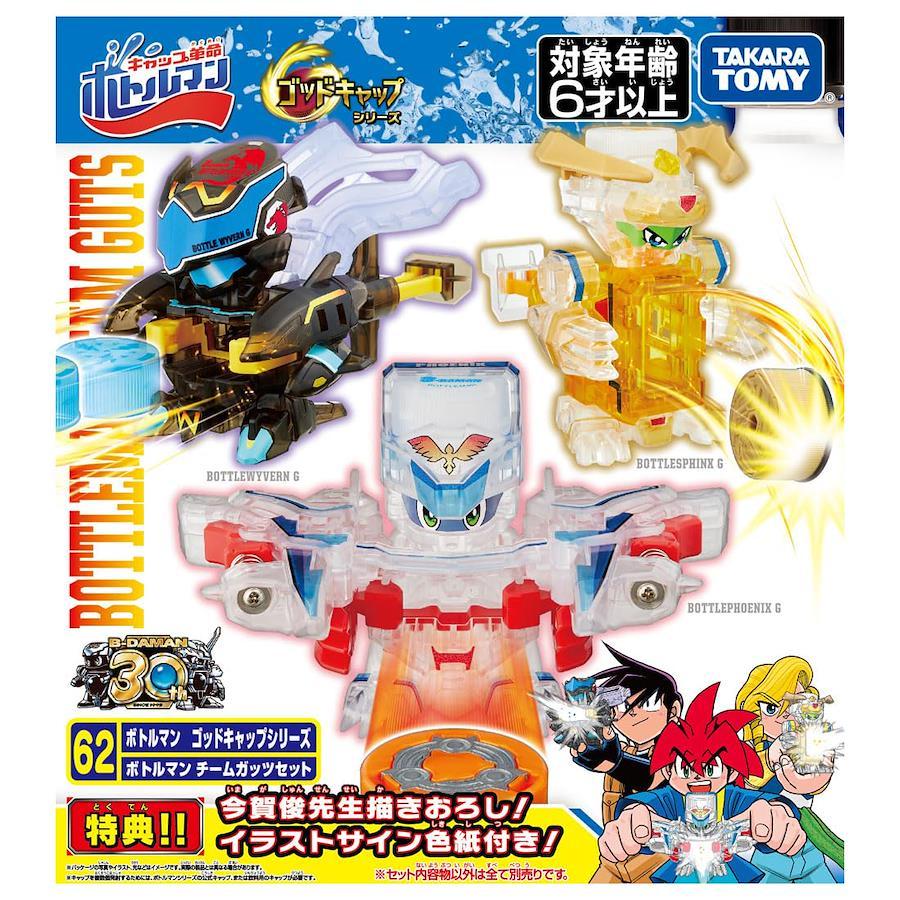 ペットボトルキャップを発射するシューティングホビー!身近にあるペットボトルやキャップでもすぐに遊べる!ビーダマンコラボ機体「ボトルフェニックスG」「ボトルワイバーンG」「ボトルスフィンクスG」がクリアの3体セット「ボトルマン チームガッツセット」となって登場!なんと「爆球連発!!スーパービーダマン」の作者、今賀俊先生描き下ろしのイラストサイン色紙もついてくる!