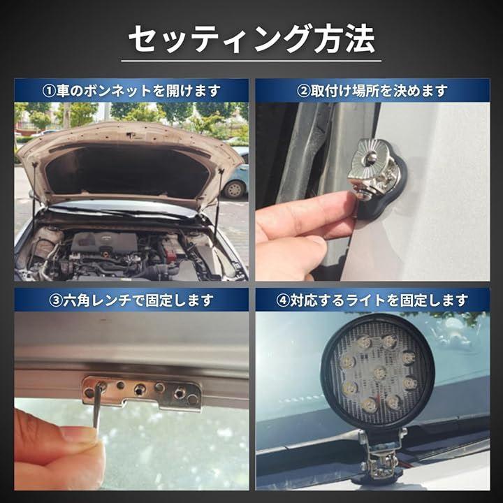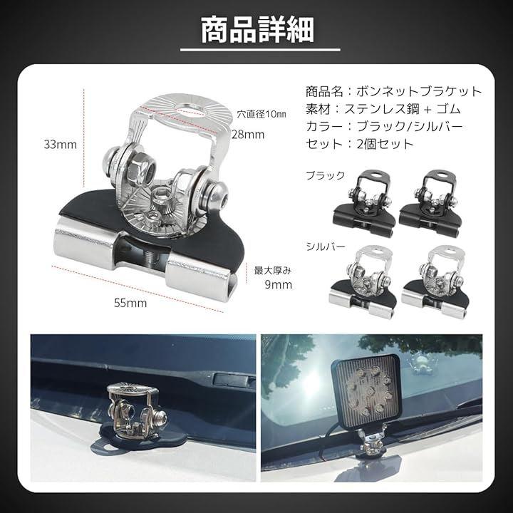 「商品概要」ボンネットに作業灯、フォグランプ、ワークライト、サーチライトなどを取り付けるための汎用タイプのブラケットになります。