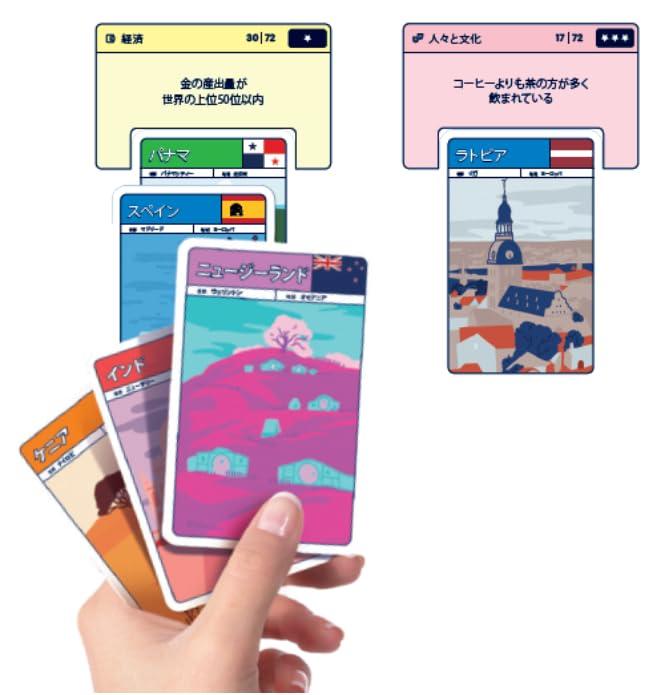 「条件カード」の問題は全126問で、手札からプレイする国は全72か国あり、1回のゲームで使用するのはプレイヤー1人につき4か国だけなので、同じ問題でも様々な組み合わせがプレイできます。