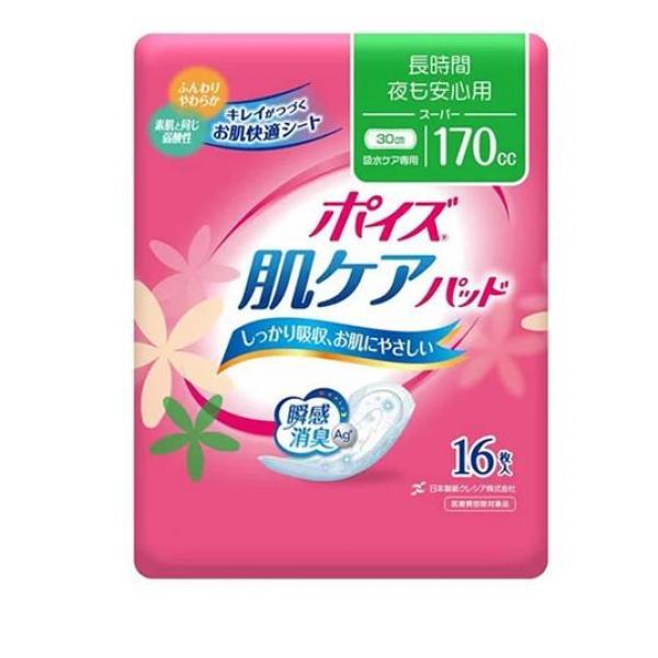 製品の特徴●クレシア ポイズ 肌ケアパッド 長時間・夜も安心用 スーパー 170cc 吸水ケア専用●すぐに消臭ニオイ戻りも防ぐ、さらに24時間抗菌でニオイ菌の増殖を防ぐ。●水分をしっかり閉じ込め、表面のさらさら感がつづく。●2枚重ねの立体ギャザーとサイドギャザーが横モレを防ぐ。●つけ心地ふんわり。●素肌と同じ弱酸性。●ムレにくい全面通気性。●かわいい花柄エンボス。●医療費控除対象品。●吸水パッド/吸水パット/尿漏れパッド/軽失禁パッド/おしっこ/トイレ/介護用品●品名:女性用軽度尿吸収製品(大人用紙おむつ)●吸収量の目安:170cc●サイズ:幅12cm×長さ30cm