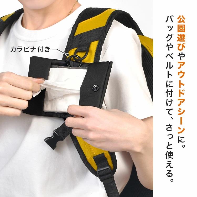 【エチケットポーチ】ポケットティッシュからウェットティッシュまでコンパクトに持ち歩ける、便利なティッシュホルダー。キーホルダー感覚で使えるカラビナ付きで、バッグやベルトに取り付けてさっと取り出せます。公園遊びやアウトドア、旅行、フェスなどのレジャーシーンにも活躍するアイテムです。
