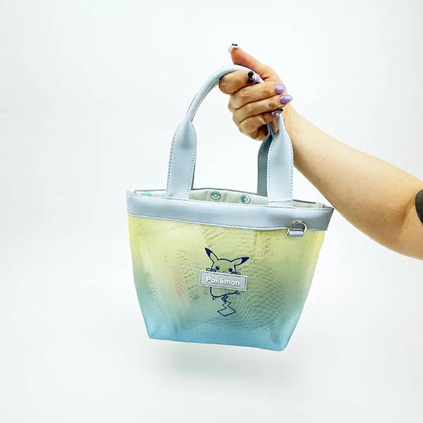 ピカチュウのトートバッグです♪グラデーションカラーのメッシュ生地と裏地はモンスターボール柄♪ぜひ同シリーズのグッズと合わせて使ってください☆彡