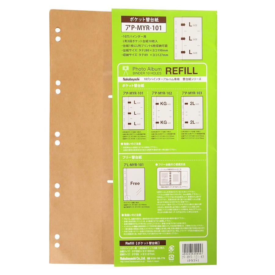 10穴バインダー式・L判3段ポイントシールポケット台紙(クラフト)10枚写真収納枚数/台紙1枚にL判プリント6枚収納可能 本体寸法:タテ280×ヨコ190mm 規格:L判3段ポケットポイントシール台紙(クラフト)10枚(写真収納枚数1枚にL判6枚) 10穴タイプ ナカバヤシのバインダー式アルバム専用替台紙 規格サイズ:280×190mmのバインダー式10穴対応のポケット替台紙です。