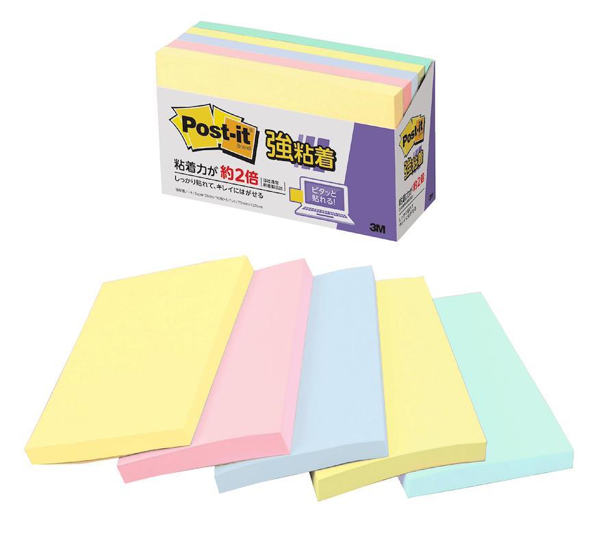 ●ふせんサイズ:75x127mm。 たっぷり書き込める大判サイズのポストイット付箋。詳しい伝言や記録、掲示や在庫整理などに便利なサイズです。●約2倍*の強粘着タイプで、クリアファイルやパソコン、電話などの樹脂面や、キャビネットや家具などのスチール面、扉、壁などの垂直面、ダンボールなど、つきにくかった場所にもしっかり貼れるので、大切な伝言やメモに最適です。しっかり貼れてきれいにはがれるのが特長の製品です。(*当社通常粘着比)●90枚x5パッド。●色分けにも便利な混色タイプ。●色:イエロー、ピンク、ネプチューンブルー、アップルグリーン●本体:古紙パルプ配合率100%の再生紙。粘着剤:アクリル系粘着剤。●エコマーク取得。●グリーンマーク取得。グリーン購入法適合。●GPNエコ商品ねっと掲載。●中身が見やすく取り出しやすい、収納にも便利な紙製スリーブケース入り。