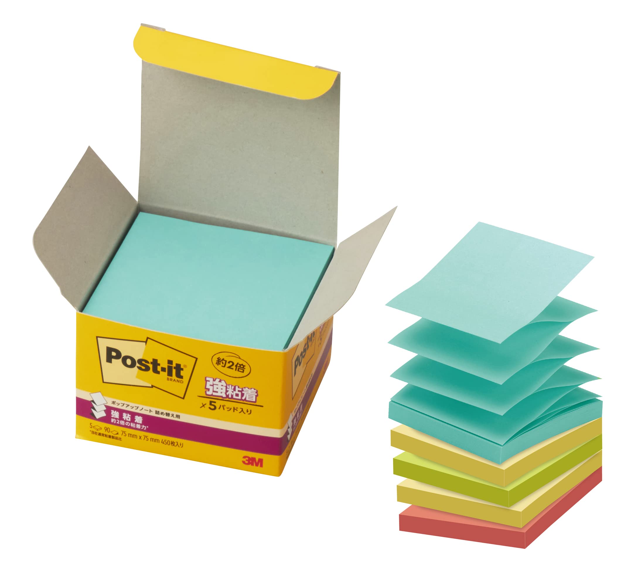 ポストイット ポップアップディスペンサー専用の詰め替え5冊パック。片手でサッと簡単に、ティシューのように一枚ずつ取り出せる、ポップアップ式。最後の一枚までムダなく使える。電話やパソコン操作中などの、メモやメッセージにとっても便利。ディスペンサーにセットして使うポストイット ノートだから、いつも机の定位置に。使いたい時に「粘着メモがない」なんて事もこれで解消!カラー:イエロー、アクアスプラッシュ、アシッドライム、グァバ枚数:90枚×5冊(1冊あたりのサイズ:75×75mm)【免責事項】メーカーによる商品リニューアルに伴いパッケージが変更が行われた場合、新パッケージでお届け致します事ご了承願います。