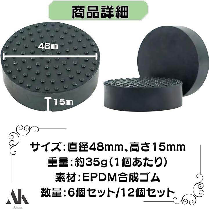 「商品スペック」サイズ:直径48mm、高さ15mm、重量:約35g(1個あたり)、素材:EPDM合成ゴム、数量:6個セット/12個セット