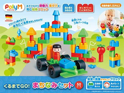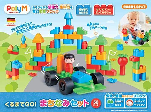 PolyM(ポリエム)とは、ドイツのマイスターが娘のために作った30年以上の歴史がある知育ブロックです。大きくて握りやすいソフトな感触のブロックです。洗濯機で丸洗いできるのでいつでも清潔を保つことができます。くるまでGO!まちなみセットでは、さまざまな形のブロックを自由に組み合わせて建物など街並みをつくることができます。他にも車やどうぶつなども組み立てることもできます。組み立てた街にくるまなど走らせて遊ぶこともできます。想像力・集中力を育みながらブロック遊びを楽しみましょう!対象年齢:1.5歳以上
