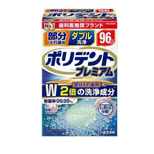 製品の特徴●HALEON ポリデントプレミアム 部分入れ歯用 W(ダブル)洗浄●2倍の洗浄成分が発生(*1)。ガンコな汚れを強力に取り除き、入れ歯の白さを維持(*2)します。●ニオイの原因菌・カビの一種・細菌まで、3分で99.99%(*3)除菌・速効洗浄。1回目からの使用でも、入れ歯を徹底的にきれいにします。●隅々まで効果が届き漂白促進します。●黄ばみや汚れを分解・洗浄し、着色汚れ落とします。●研磨剤不配合なので、入れ歯を傷つけず、入れ歯に汚れが溜まりにくいです。●部分入れ歯の金具が変色しづらい、金具にやさしい処方です。●品名:入れ歯洗浄剤(発泡錠)●用途:入れ歯、歯列矯正金具、マウスピースの洗浄(一部の部分入れ歯には使用できません)●液性:弱アルカリ性●内容量:2.7g×96錠