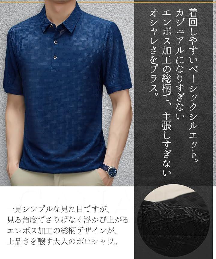 一見シンプルな見た目ですが、見る角度でさりげなく浮かび上がるエンボス加工の総柄デザインが、上品さを醸す大人のポロシャツ。