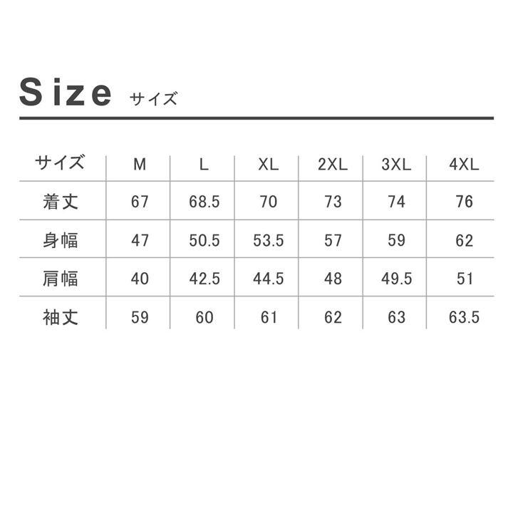 「サイズ」「M」着丈67 / 身幅47 / 肩幅40 / 袖丈59・「L」着丈68.5 / 身幅50.5 / 肩幅42.5 / 袖丈60・「XL」着丈70 / 身幅53.5 / 肩幅44.5 / 袖丈61・「2XL」着丈73 / 身幅57 / 肩幅48 / 袖丈62・「3XL」着丈74 / 身幅59 / 肩幅49.5 / 袖丈63・「4XL」着丈76 / 身幅62 / 肩幅51 / 袖丈63.5 *サイズに多少の誤差がある場合がございます。
