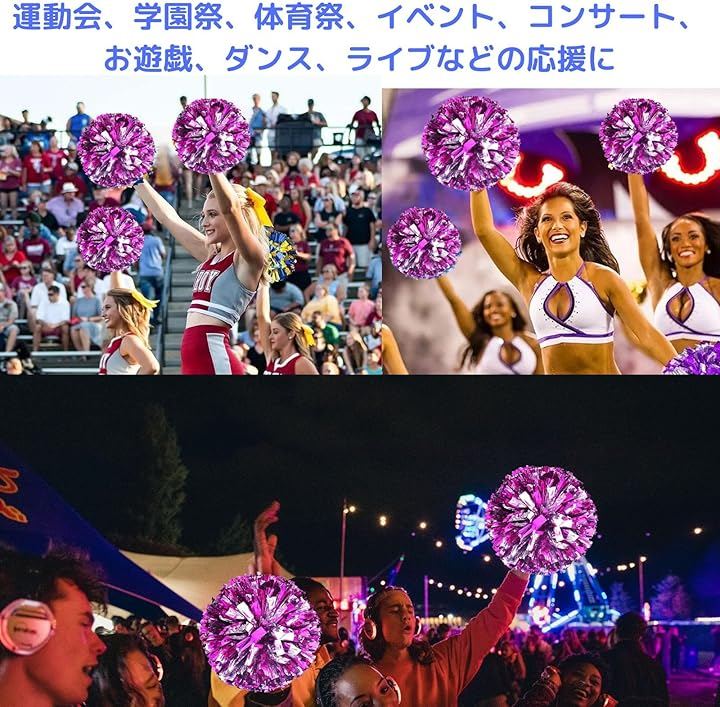 「適用性が広い」ポンポンは運動会、学園祭、体育祭、イベント、コンサート、お遊戯、ダンス、ライブなどの応援に最適な盛り上げグッズです。